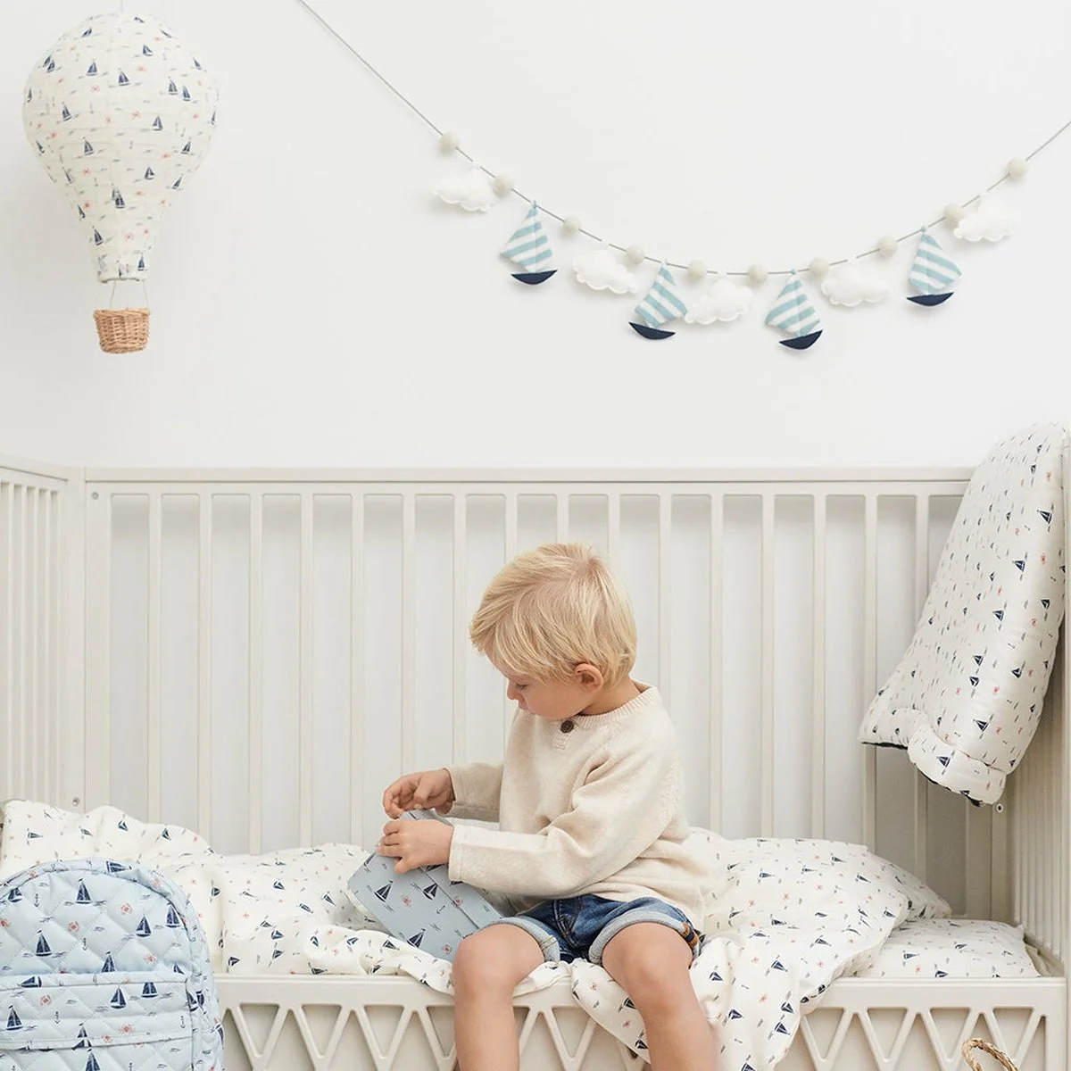 Deze mooie stoffen lamp in de vorm van een luchtballon van het merk Cam Cam Copenhagen zorgt ervoor dat de babykamer voorzien wordt van een mooi en sfeervol licht. De lamp heeft een sailboats printje en een wit kleurig snoer. Het wordt geleverd met een E14 fitting en snoer van 3 meter.