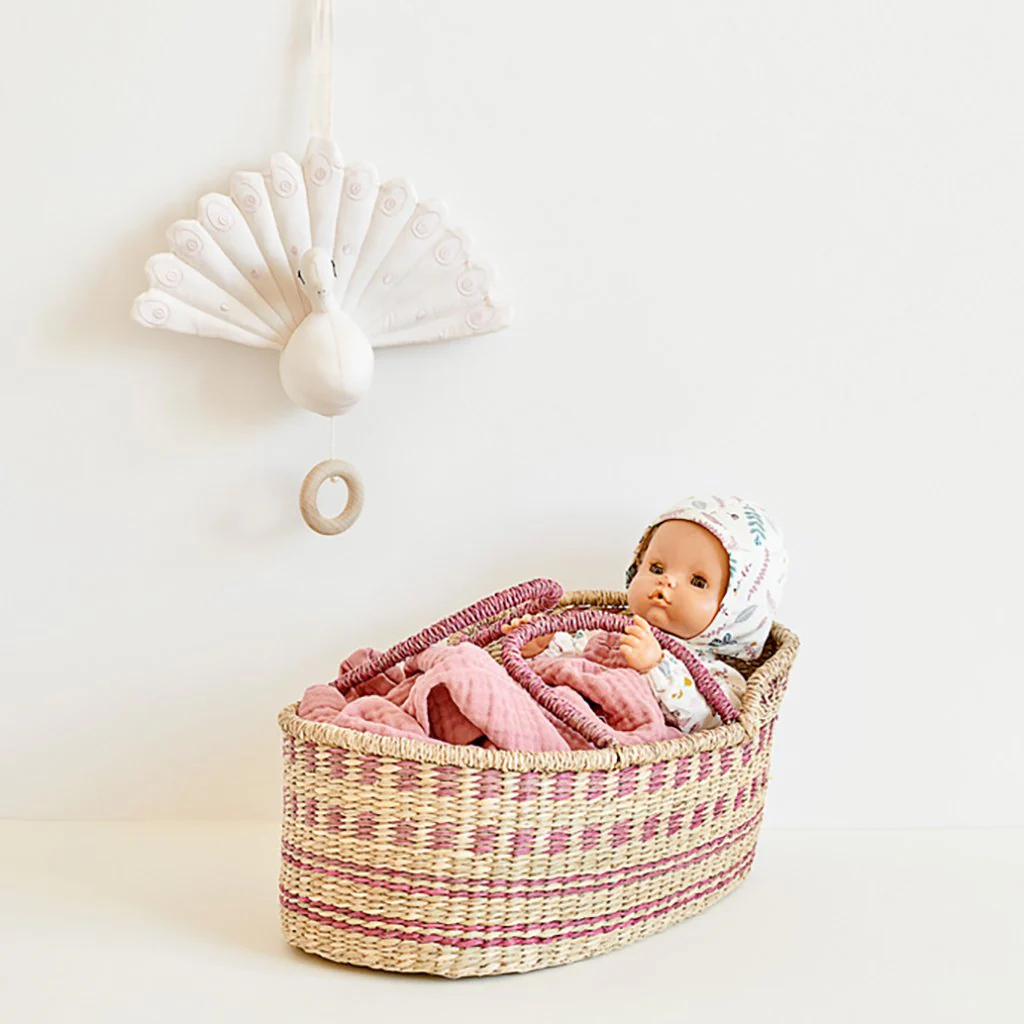 Leuke Moses Mand voor poppen. Handgemaakt van 100% natuurlijk zeegras. Met de Moses poppen draagmand kan het kind genieten van het spelen van zijn / haar poppen en deze veilig en gemakkelijk door het huis dragen. Past perfect bij de Cam Cam Copenhagen biologische poppen en poppenaccessoires.