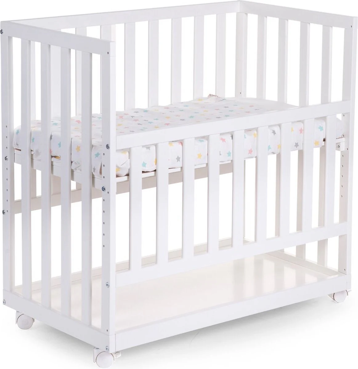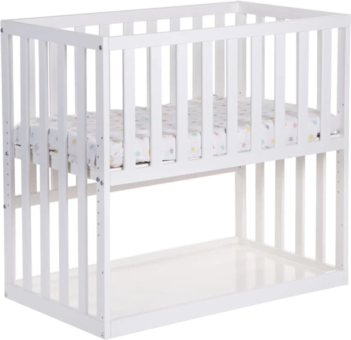 De zijkant van het bedje kan op 3 hoogtes worden versteld (85cm, 59,5cm en 46cm) en kan volledig verwijderd worden.