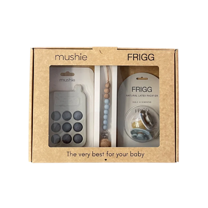 De giftbox bevat een combinatie van geliefde Mushie- en FRIGG-producten, gemaakt van hoogwaardige, veilige materialen die zowel praktisch als duurzaam zijn.