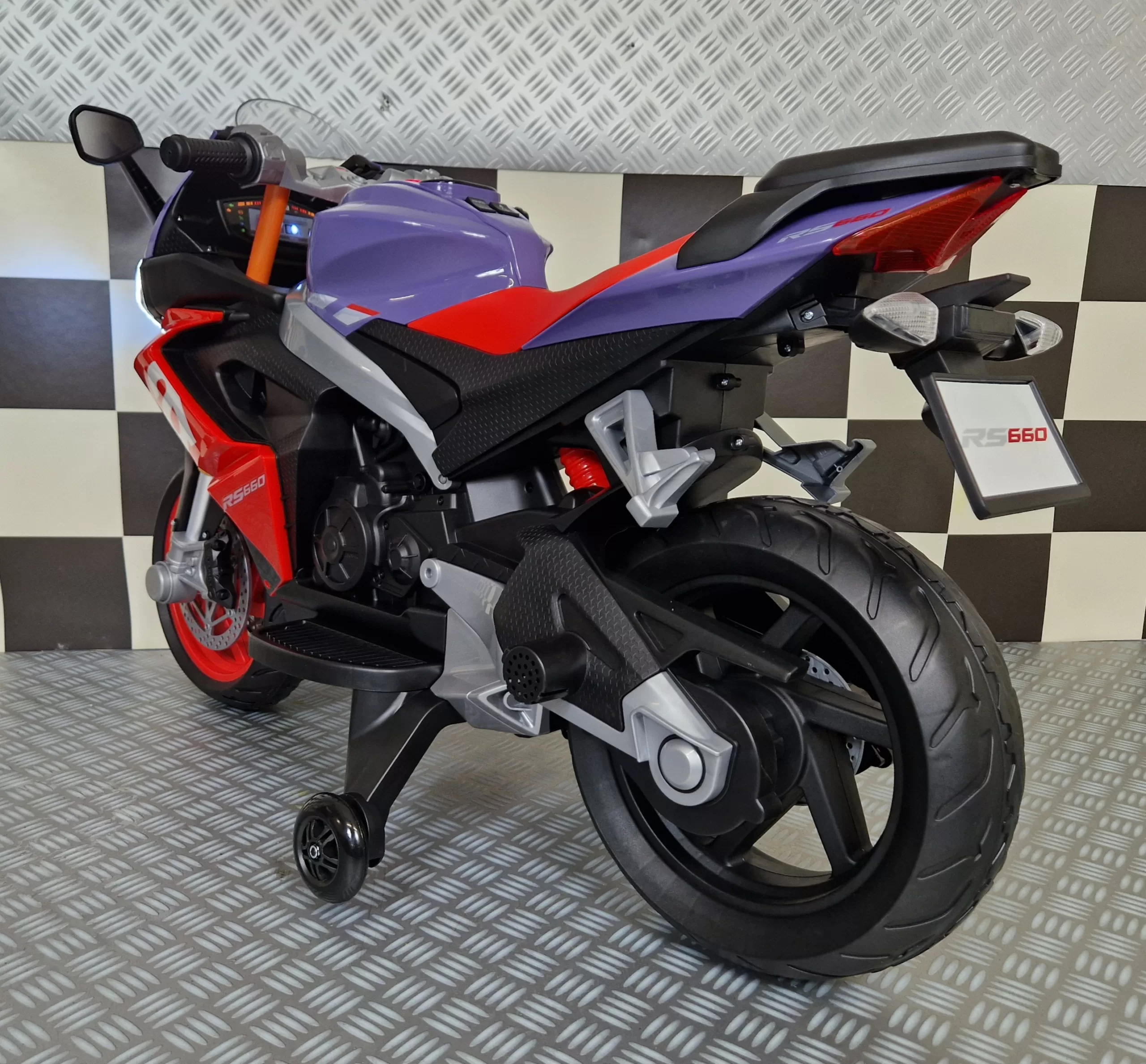 De Aprilia RS660 elektrische kindermotor is uitgerust met een 12 volt 7ah accu. afmetingen zijn L:108XB43XH68 geschikt voor kinderen van 3 tot 5 jaar.