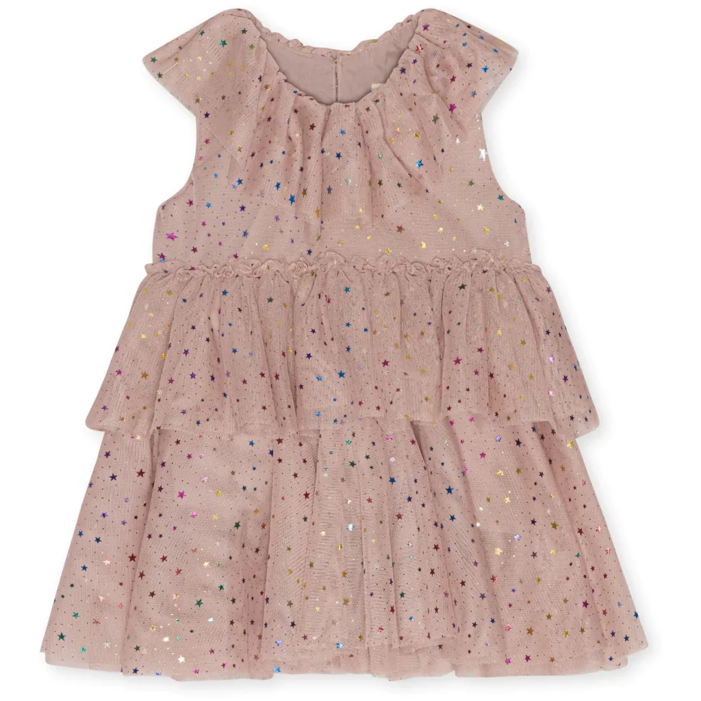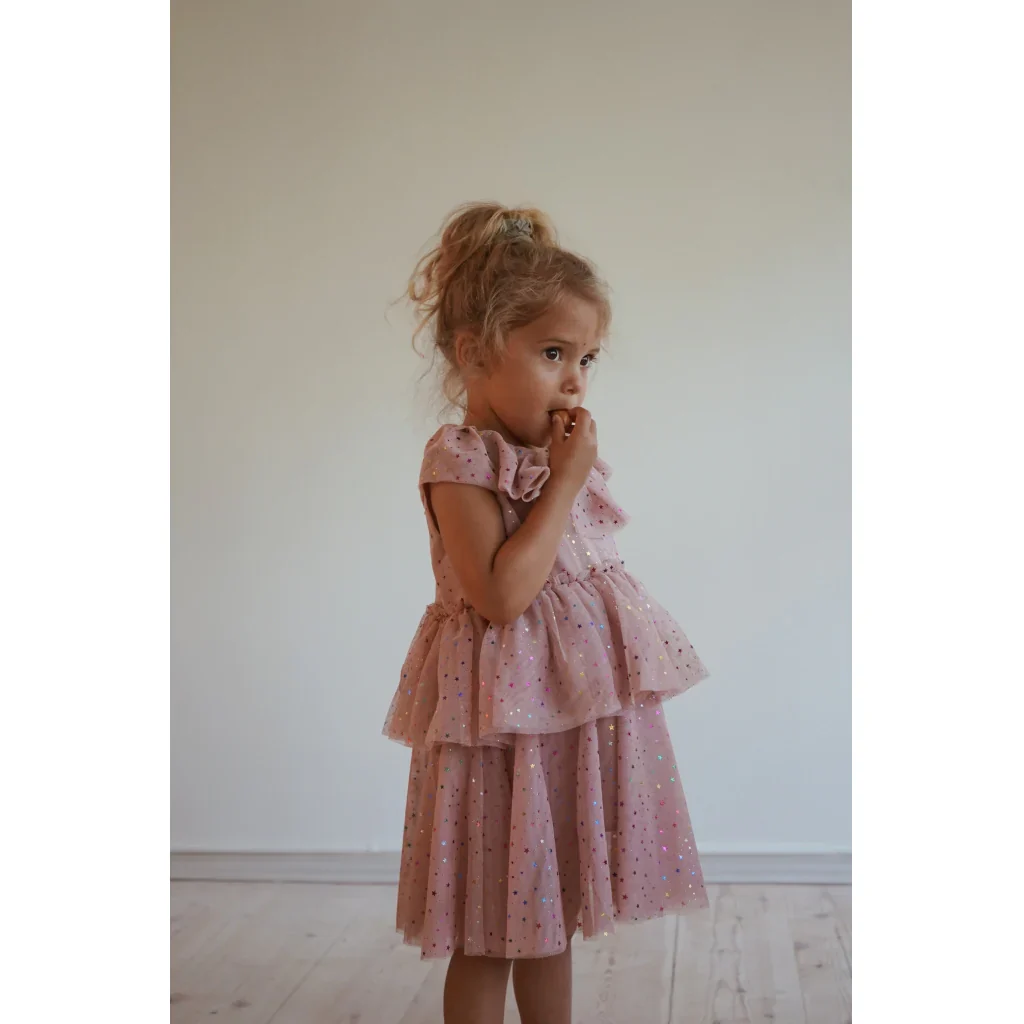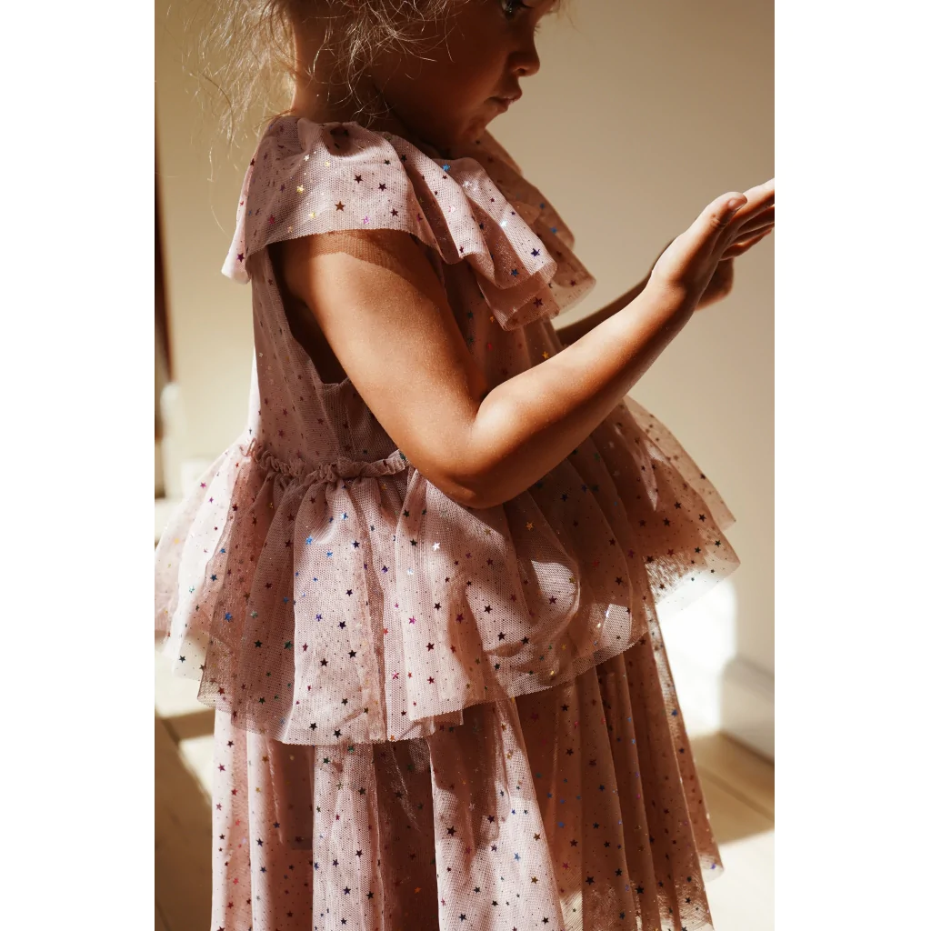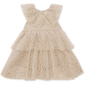 Deze prachtige feeënjurk is perfect voor kleine dromers. Met een luchtig ontwerp en elegante ruches, straalt de jurk een magische sfeer uit. De driedelige constructie combineert zachte katoen aan de binnenzijde met knisperend tule aan de buitenkant. De parelmoeren knoopsluiting in de nek voegt een verfijnd detail toe.