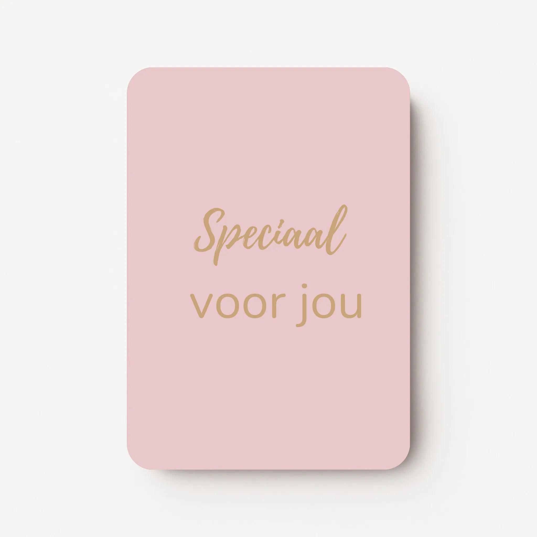 Dit minikaartje in lichtroze met de tekst “Speciaal voor jou” in goudbeige letters is het perfecte gebaar om iemand te laten weten dat je aan hem of haar denkt. Stel je voor: een klein cadeautje, een bos bloemen of een zorgpakket dat nét dat beetje extra persoonlijke aandacht krijgt door dit kaartje erbij.