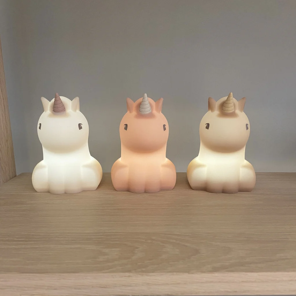 Dit schattige unicorn nachtlampje staat leuk in elke baby en kinderkamer. Het is een oplaadbaar nachtlampje, je hebt dus geen batterijen nodig. Het nachtlampje gaat aan via een drukknop aan de onderkant en blijft 12 uur lang branden, het lampje kan je weer in 4 uur opladen met de bijgeleverde usb adaptor. Bij dit nachtlampje is gebruik gemaakt van LED techniek waardoor het energie zuinig is, de lamp wordt niet warm en kan veilig door kinderen worden gebruikt. Wanneer je de lamp uitzet en de stekker in het stopcontact laat brandt er een indicatie lampje die de hele unicorn licht verlicht (glow in the dark effect).