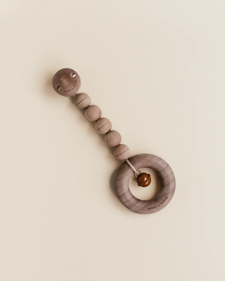 De wagenhanger puck bestaat uit grote houten kralen (met en zonder groeve), een ring, een belletje en onze gegraveerde clips.