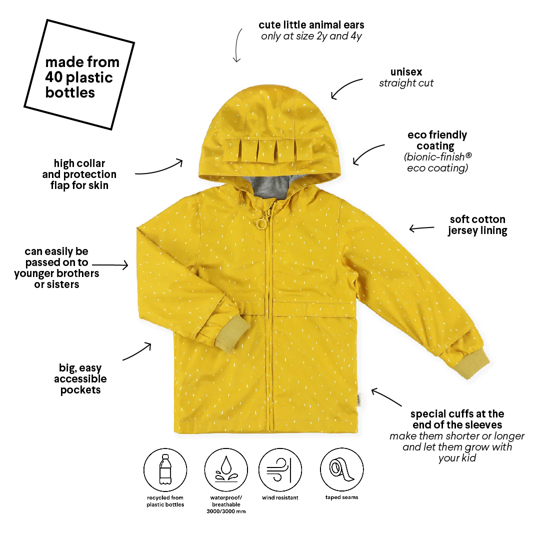 - De speelse stippen geeft de regenjas een vrolijke toets tijdens het buitenspelen. De twee kleinste maatjes hebben schattige oortjes op de kap die vrolijk rondstuiteren tijdens het rennen en spelen.