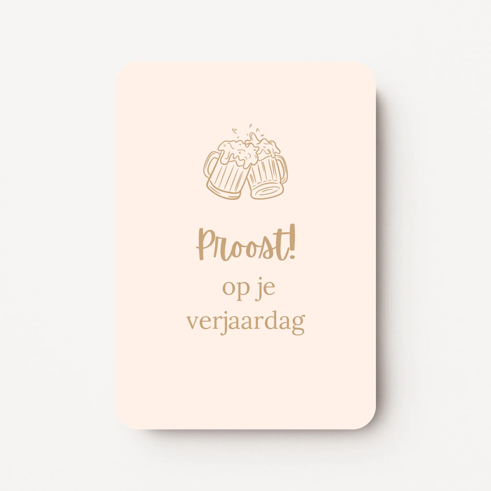 Deze gezellige verjaardagskaart combineert een warme proost-boodschap met charmante bierpul illustraties op een elegante crèmekleurige achtergrond. Perfect voor die bierliefhebber die weet dat de beste gesprekken ontstaan met een koud biertje in de hand.